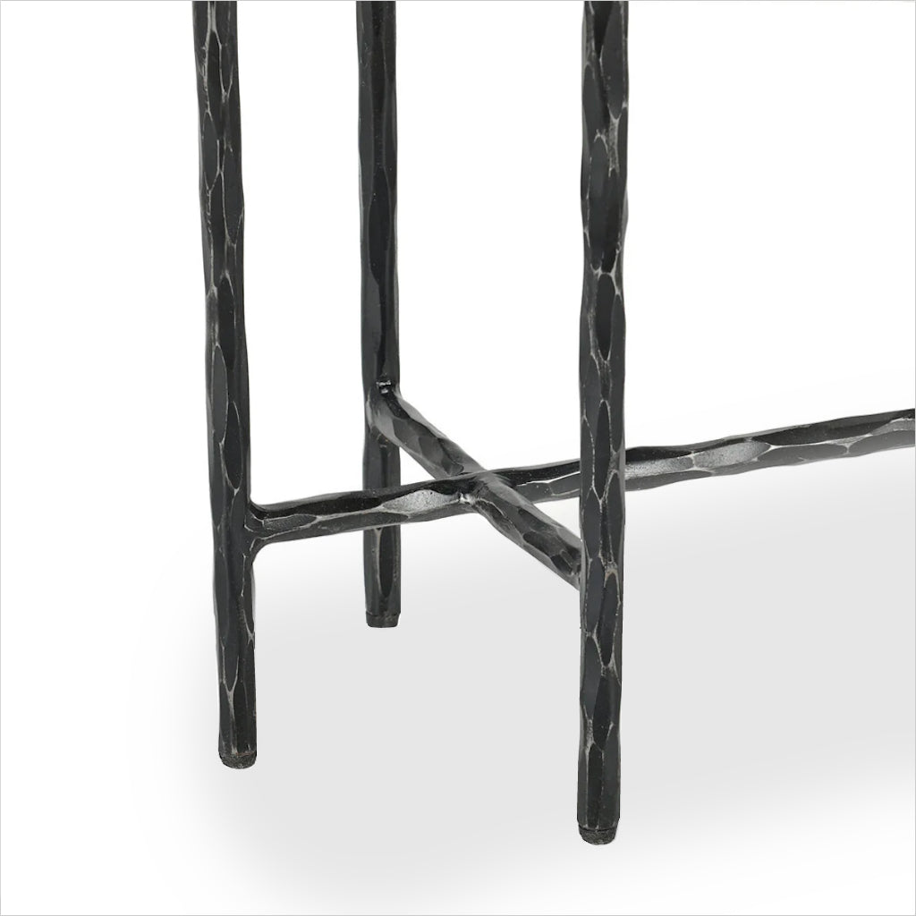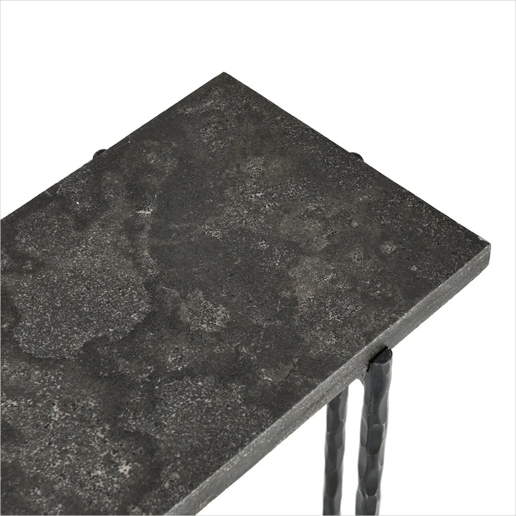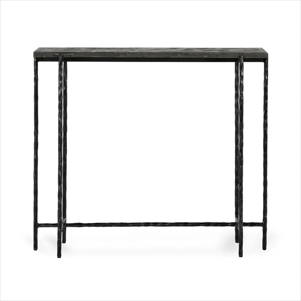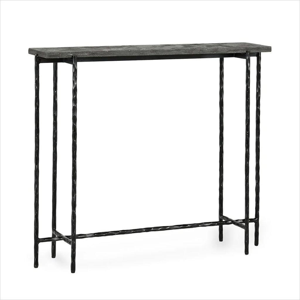 The Cameron II console table is a smaller scale yet high impact blending natural Bluestone and forged iron for a dynamic combination. The honed top is textured with a range of dark grey and earthy tones. Each stone top is considered unique having variations in colors, patterns and veins.