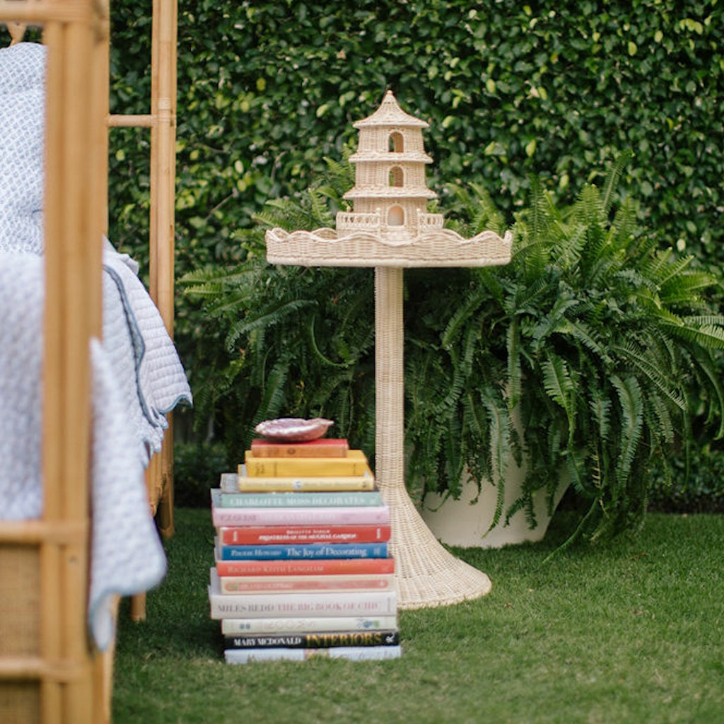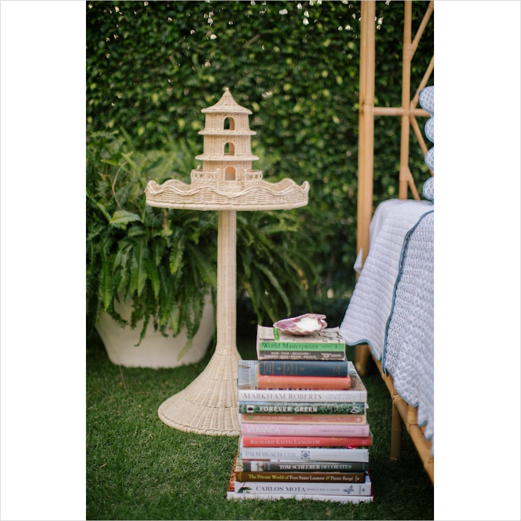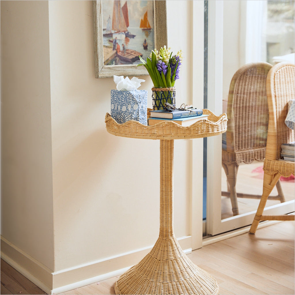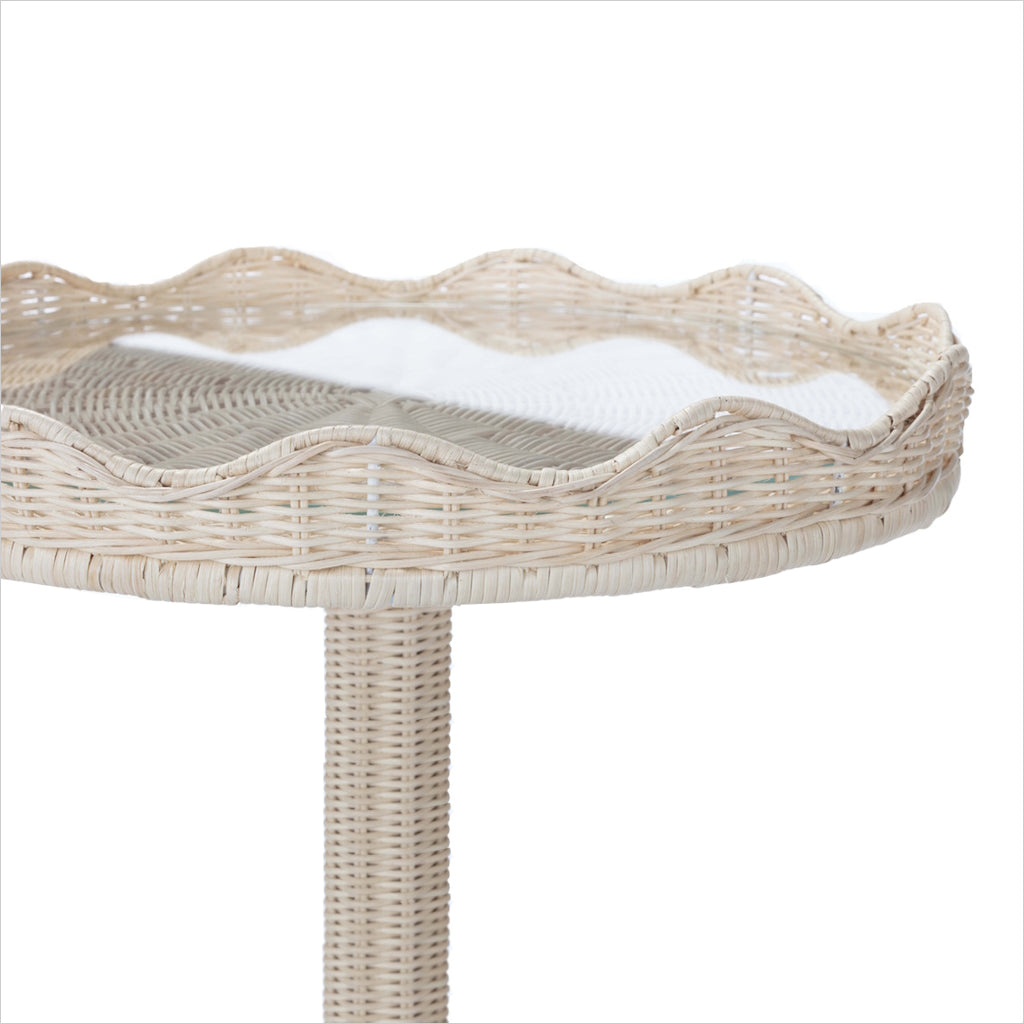 The Sloane table features a classically inspired scalloped top edge and graceful tapered pedestal. This statement piece is handcrafted in woven rattan adding natural elegance to any room while the tempered glass top makes it a durable for any occasion.